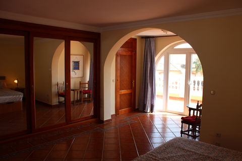 Hele øverste etage er indrettet til Master Suite. Et stort soveværelse med eget bad der har dobbelt bruser, dobbelt vask, badekar, wc og bídet. Værelset har rigelig med skabsplads.